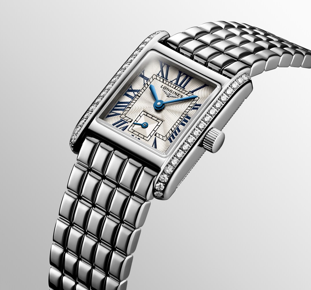 Acciaio e diamanti incastonati 0,456 carati, movimento al quarzo, quadrante argento flinqué con numeri romani dipinti e lancette azzurre in acciaio