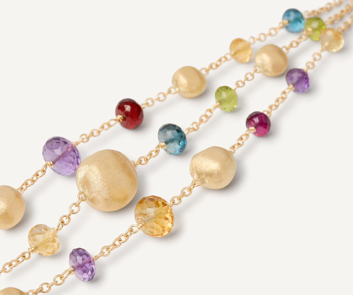 Bracciale a tre fili multicolor in oro giallo 18 kt con alternanza di sfere d’oro giallo 18 kt a pietre colorate come ametista, peridoto, quarzo oro giallo, granato, topazio london e tormalina rosa sfaccettate 4 – 7 mm