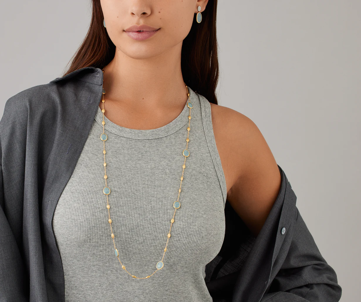 Collana oro giallo lunga con ovaline piccole e acquemarine