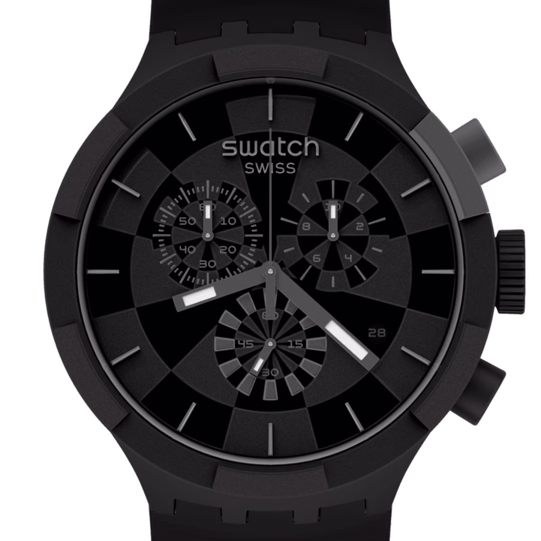 Quadrante con motivo a scacchi con finitura opaca e lucida, corona d’impatto e cinturino nero con un retro colorato in sincronia con il pulsante a ore 2 e gli accenti del quadrante