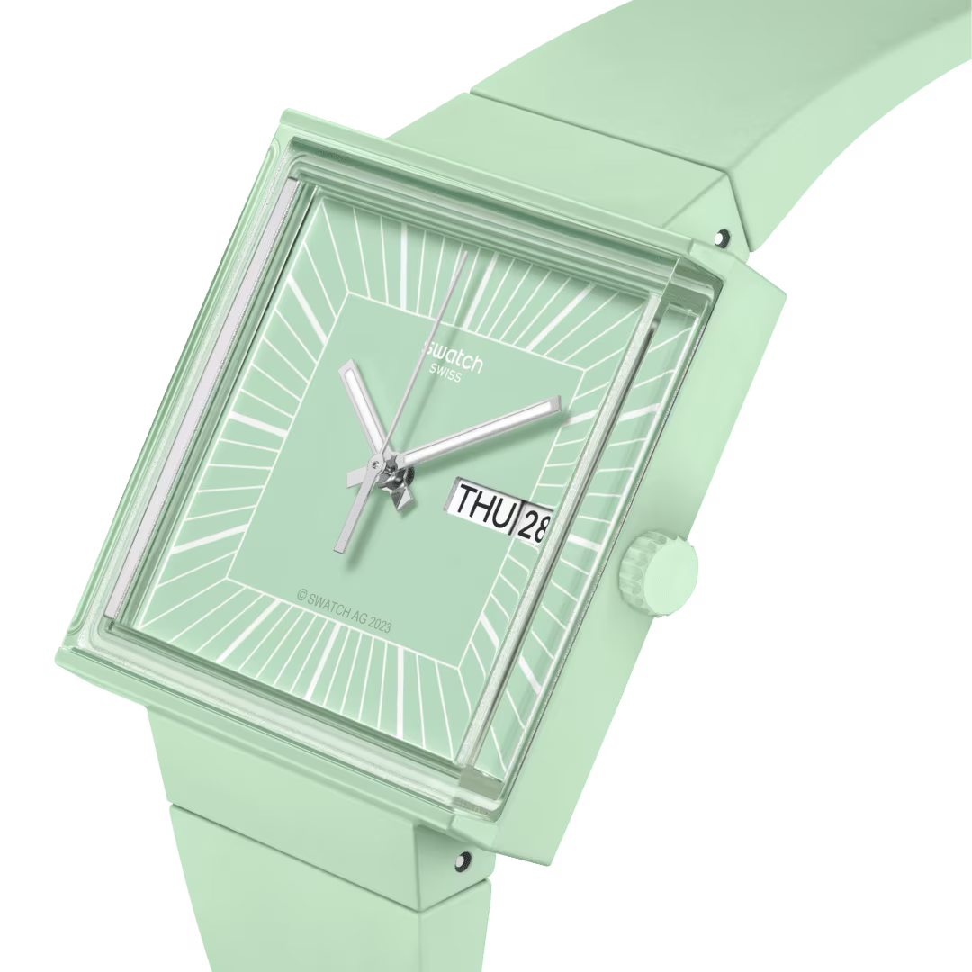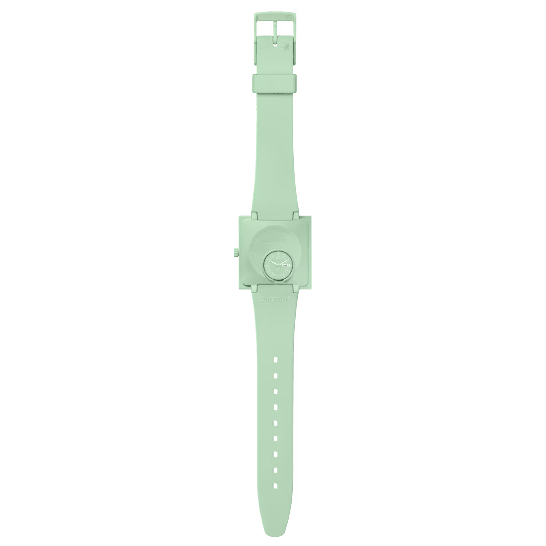 Cassa quadrata dotata di vetro biosourced edge-to-edge che permette una visione laterale degli indici bianchi stampati dell’orologio, quadrante quadrato con lancette argentate fosforescenti e cinturino biosourced integrato con fibbia bioceramic, il coperchio della batteria stampato sul retro raffigura una vista frontale dell’orologio