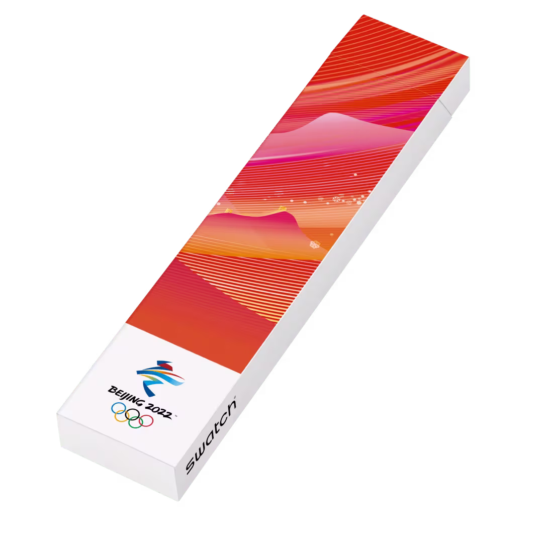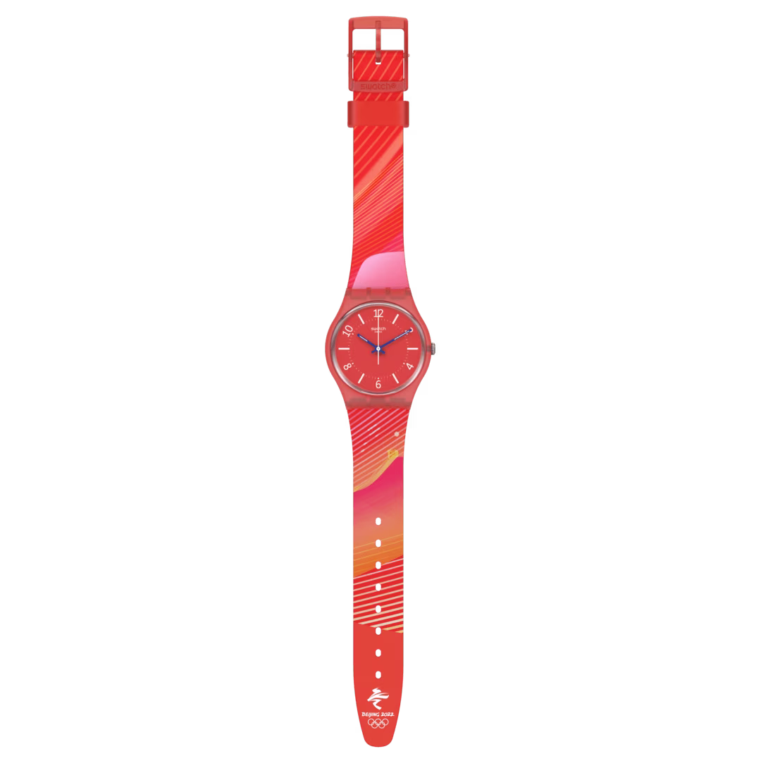 Orologio rosso dedicato ai Giochi invernali di Pechino 2022 in plastica, silicone e materiale di origine biologica, movimento al quarzo, impermeabile 3 bar, cassa trasparente di origine biologica, cinturino in silicone, lancette e indicatori nei colori olimpici