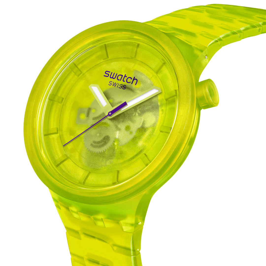 Orologio BIG BOLD in materiale di origine biologica, movimento al quarzo, impermeabile 3 bar, completamente trasparente, dalla cassa, al quadrante, alla lunetta al bracciale biosourced con fibbia a farfalla, il quadrante giallo trasparente biosourced offre una visione del movimento con lancette delle ore e dei minuti gialle fosforescenti e la lancetta dei secondi viola a contrasto
