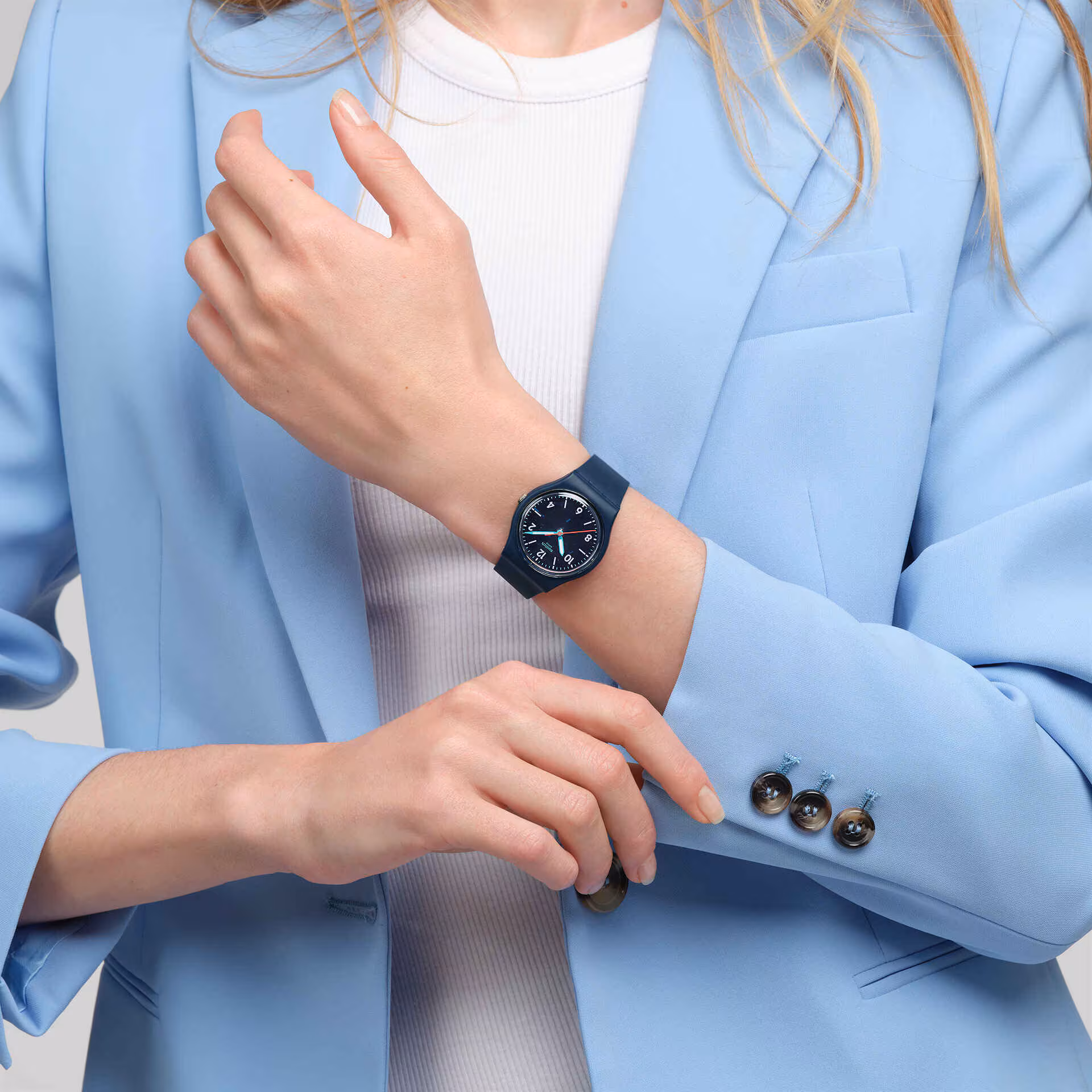 Quadrante blu navy trasparente con vetro biosurced che lascia intravedere il movimento, indici misti viola chiaro e minuteria turchese, lancette delle ore e dei minuti turchesi che si illuminano al buio e lancetta dei secondi in corallo, cassa, cinturino, passante e fibbia biosourced abbinati in colore blu navy opaco