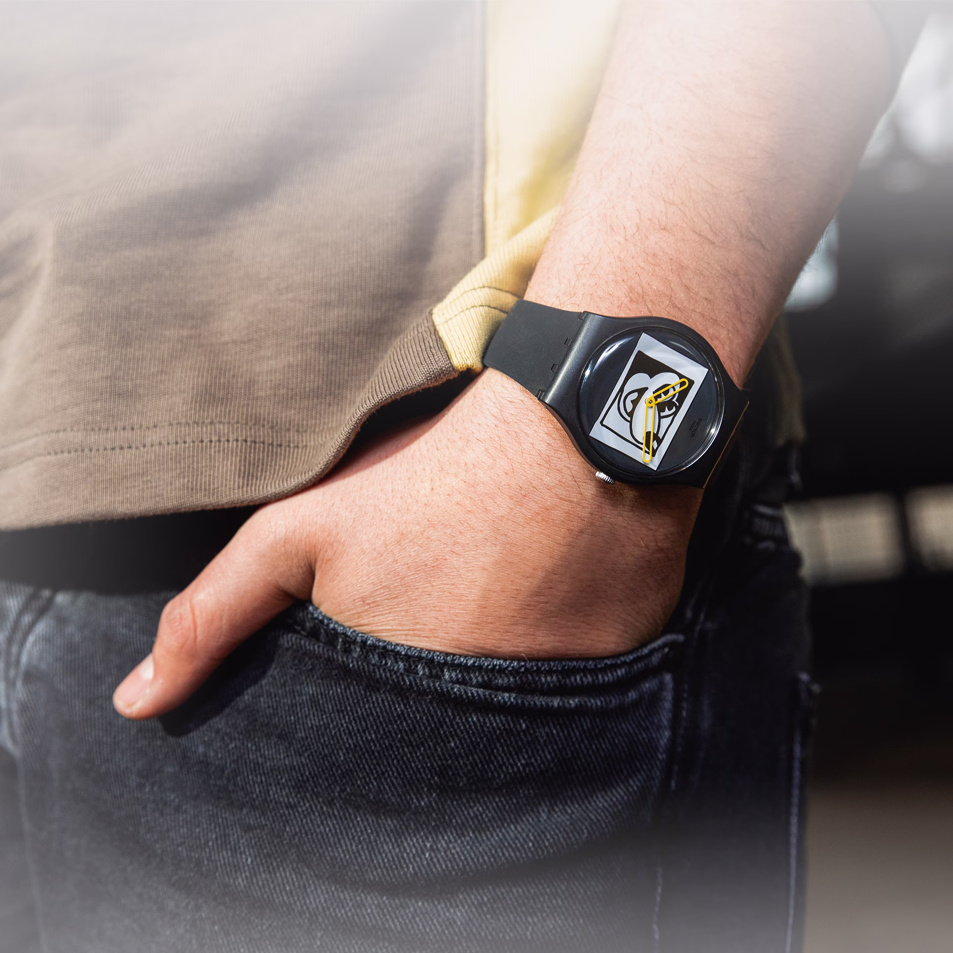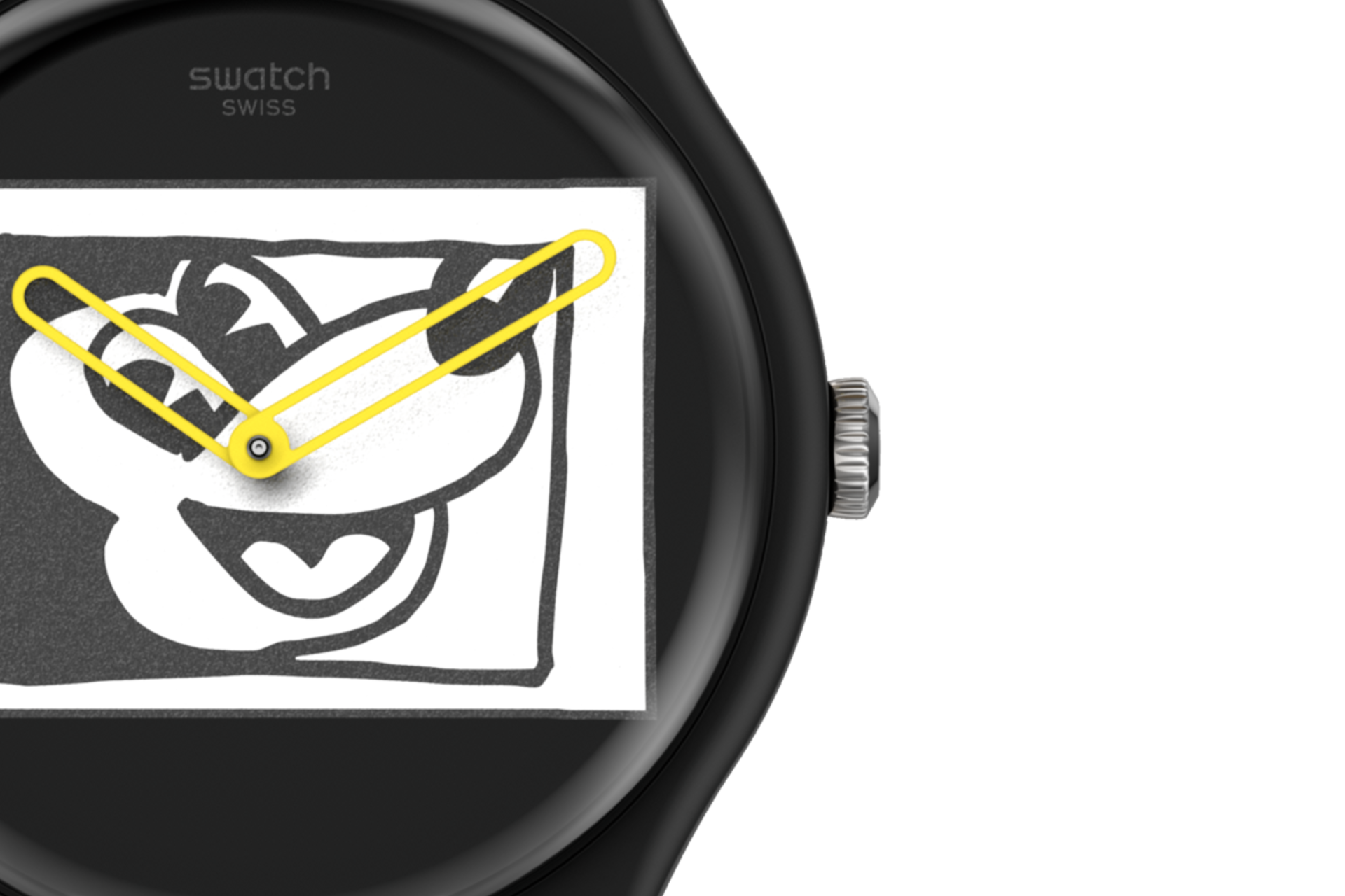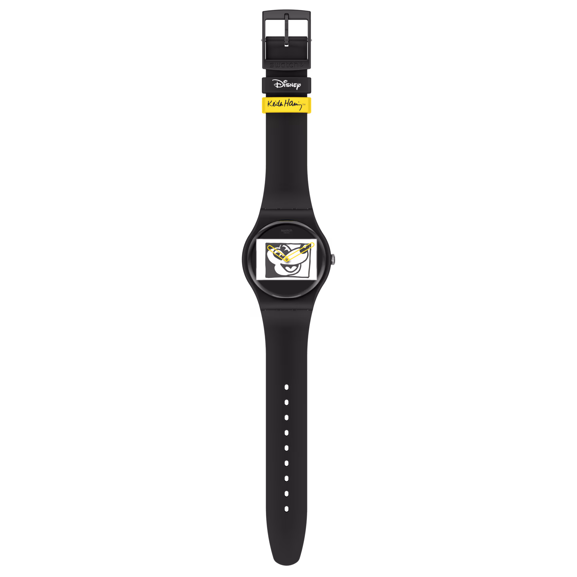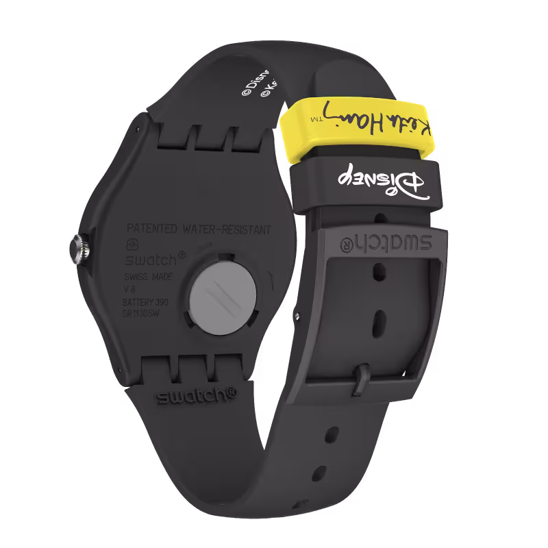 Keith Haring posiziona in modo divertente l’icona Disney al centro della scena sul quadrante, dove le lancette giallo pop permettono di vedere Topolino nel tempo e, insieme al vistoso anello, aggiungono carattere al design minimalista monocromatico