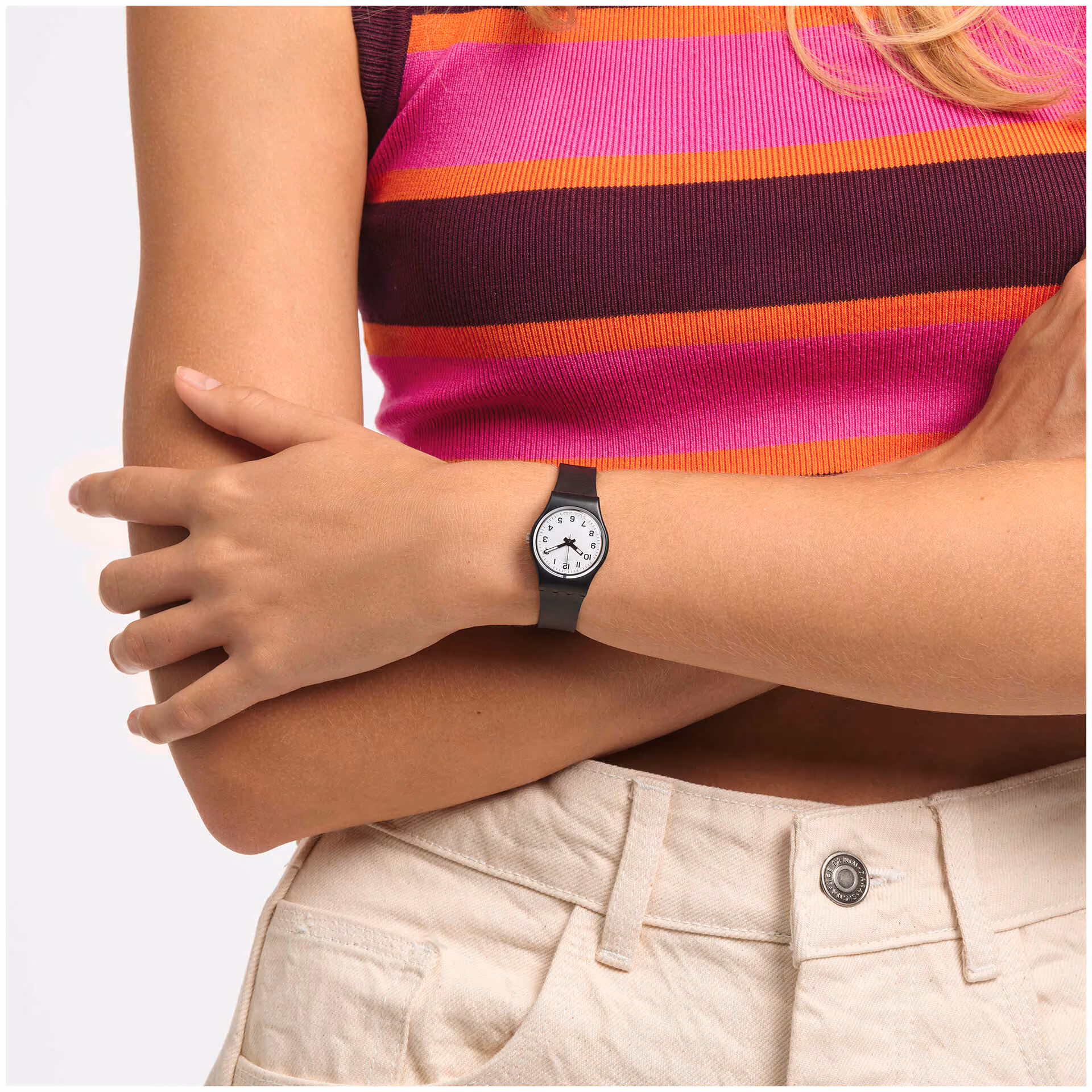 Classico ed elegante, presenta il cinturino nero in plastica che è perfettamente coordinato alla cassa e alla stampa sul quadrante bianco