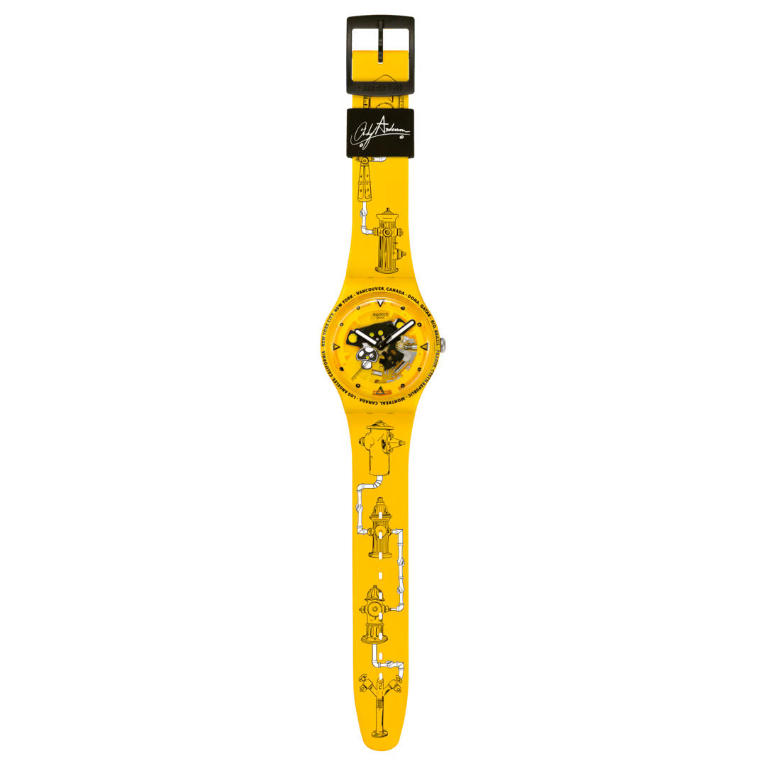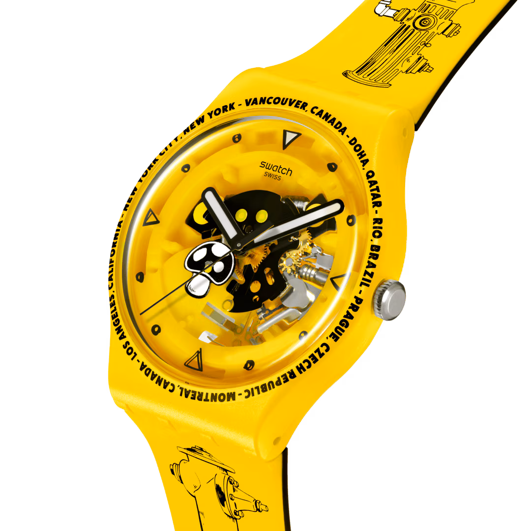 Quadrante trasparente con stampa nera e dettagli fosforescenti, lancette delle ore e dei minuti nere e fosforescenti e lancetta dei secondi nera, cassa giallo opaco con stampa nera e vetro biosourced, cinturino giallo opaco con parte inferiore nero opaco e stampa multicolore su entrambi i lati, ampio passante nero opaco con stampa bianca e una fibbia nero opaco