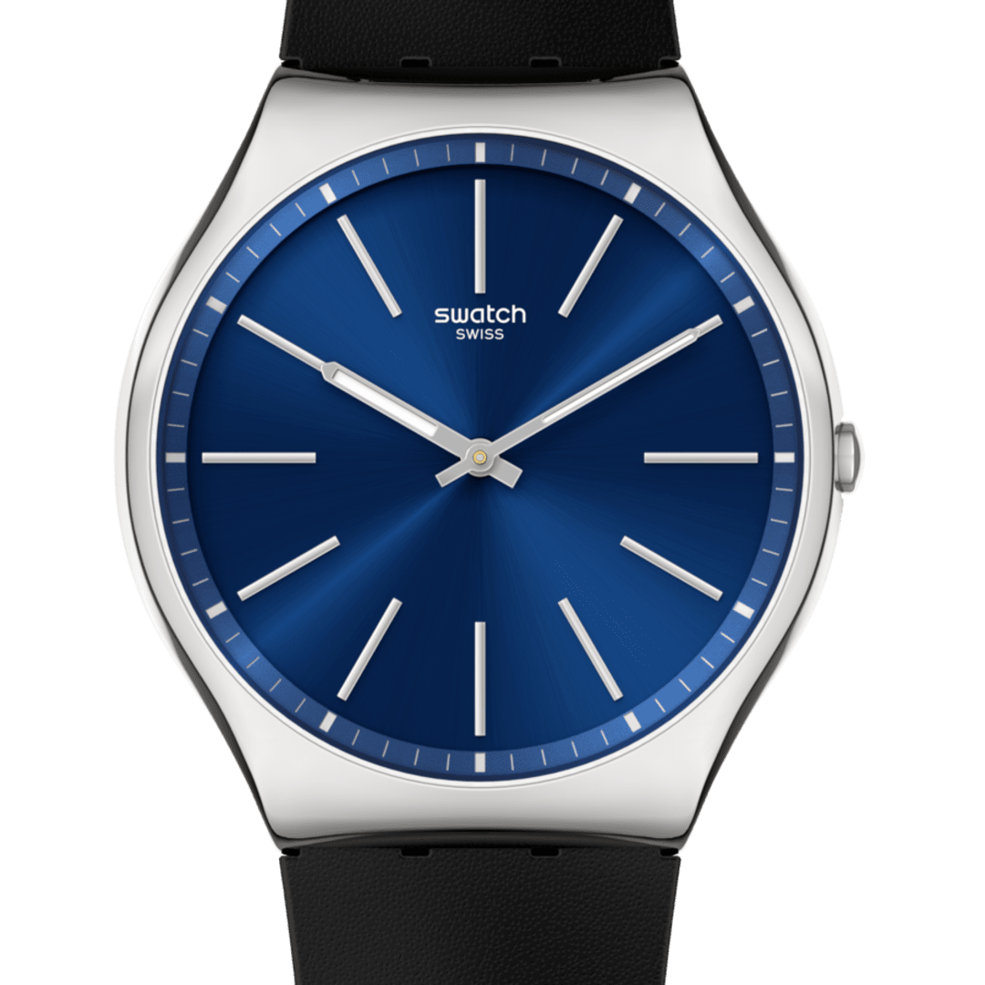 Orologio SKIN in acciaio ultraleggero, movimento al quarzo, impermeabile 3 bar con quadrante blu spazzolato soleil e inserti Swatch argentati, cinturino in pelle nera con fibbia in acciaio