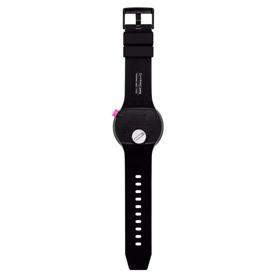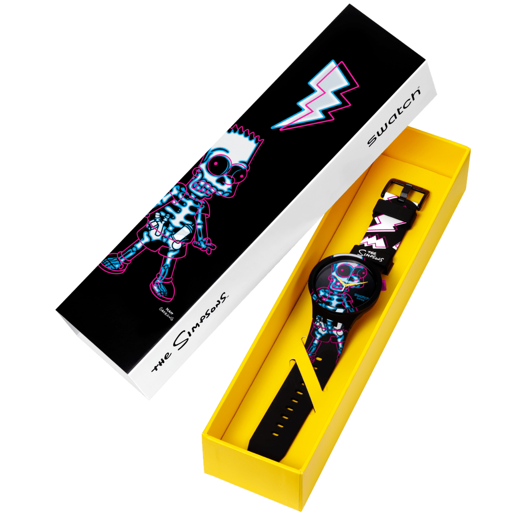 Orologio che appartiene alla collezione The Simpsons e presenta Bart Simpson multicolore stampato sul quadrante nero opaco, sulla lunetta e sul cinturino, lancette gialle a forma di saetta per le ore e i minuti e lancetta argentata per i secondi, cinturino con passanti neri opachi, con il logo dei Simpson stampato in bianco sul passante inferiore e mezza fibbia nera opaca