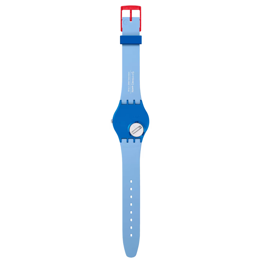 Orologio in silicone, plastica e materiale di origine biologica, movimento al quarzo, impermeabile 3 bar che parte della collezione The Simpsons Holiday Special e presenta un quadrante blu stampato con lancette rosse fosforescenti, cassa e vetro in materiale biosourced, una stampa bianca di Maggie e il cinturino stampato in azzurro ha un passante blu scuro a contrasto e una fibbia rossa