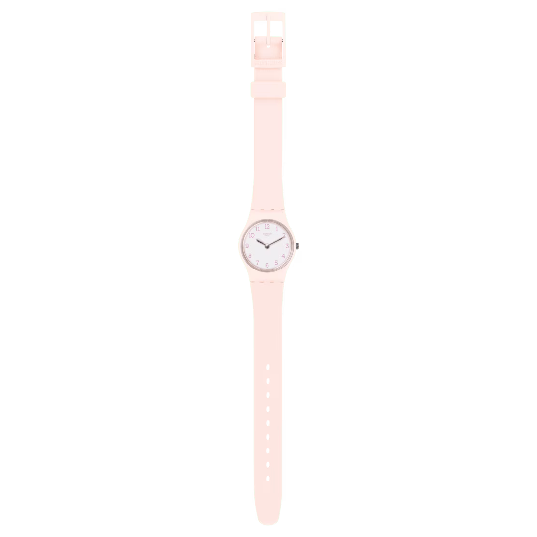 Orologio rosa satinato in silicone e plastica, movimento al quarzo, impermeabile 3 bar con quadrante bianco, indici lilla, cassa in plastica satinata rosa e cinturino in silicone opaco rosa con passante coordinato e fibbia in plastica satinata rosa