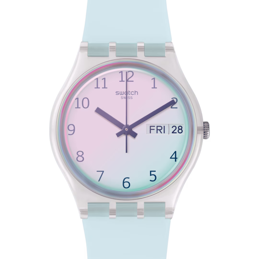 Il celeste Ultraciel del cinturino è perfettamente abbinato al bianco del quadrante, ricoperto da un vetro Swatch Solar Spectrum azzurro