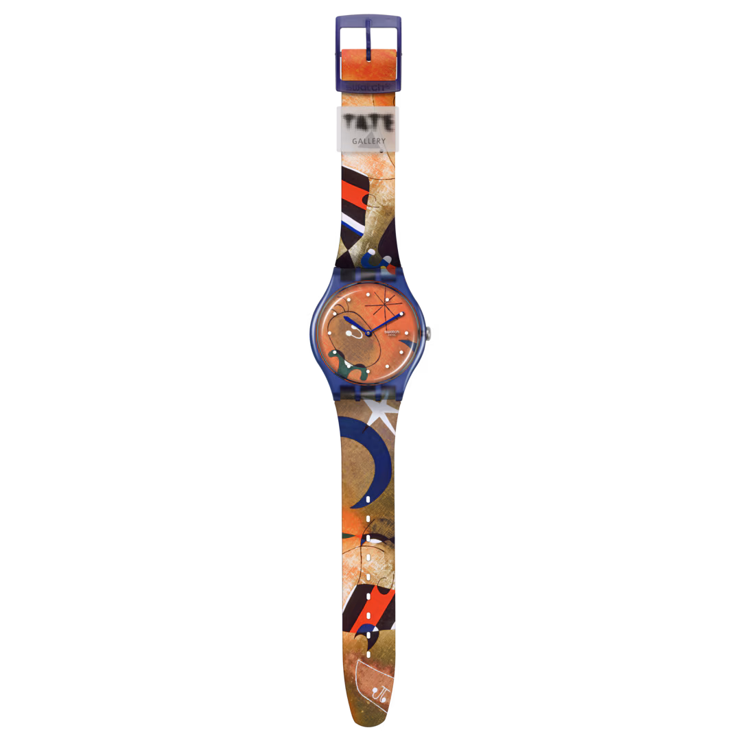 Cassa trasparente opaca di colore blu scuro con vetro biosourced e indici stampati in bianco, quadrante e cinturino trasparente blu scuro opaco presentano la stampa dell’opera Women and Bird in the Moonlight di Joan Miró, lancette blu delle ore e dei minuti e passante trasparente opaco con il logo della Tate Gallery