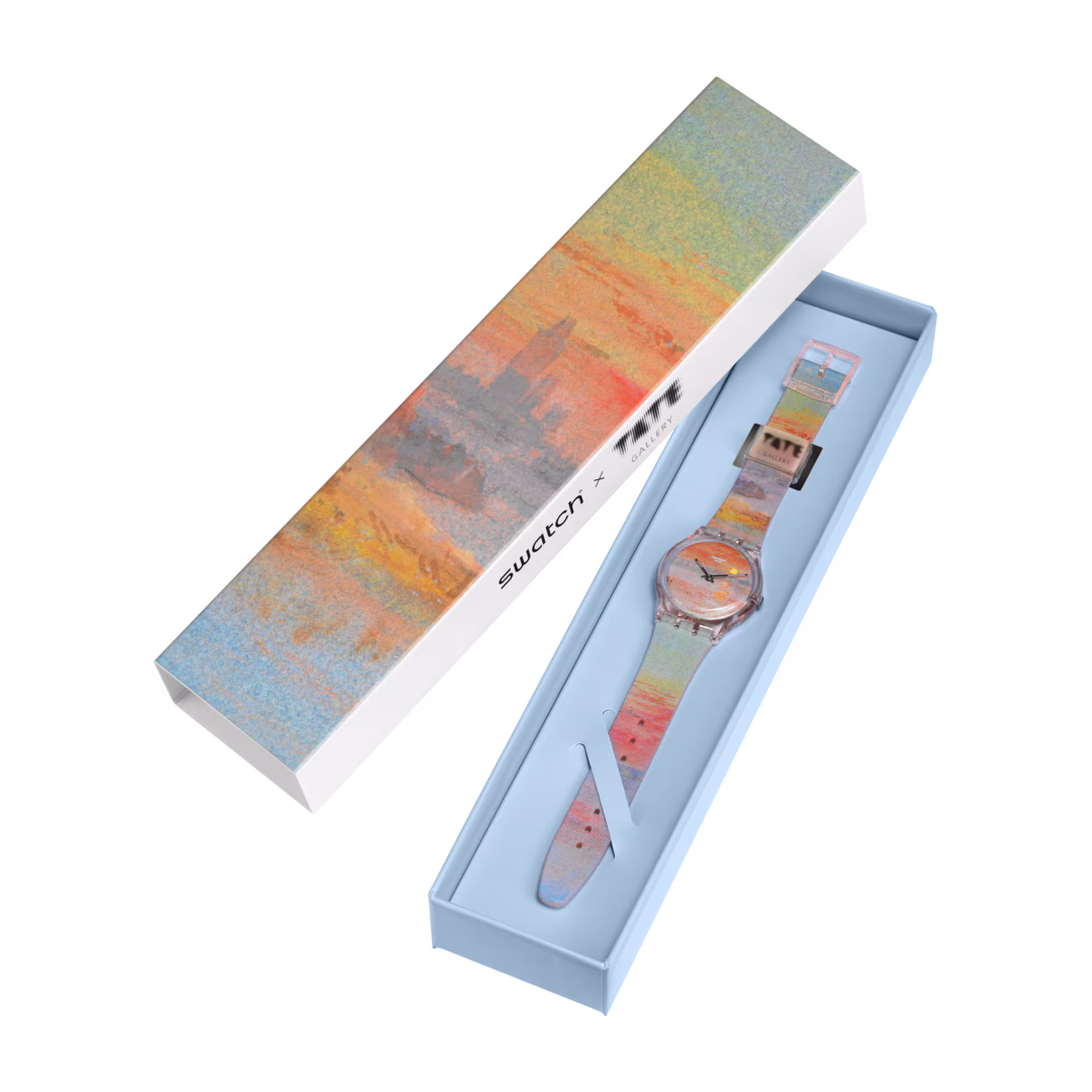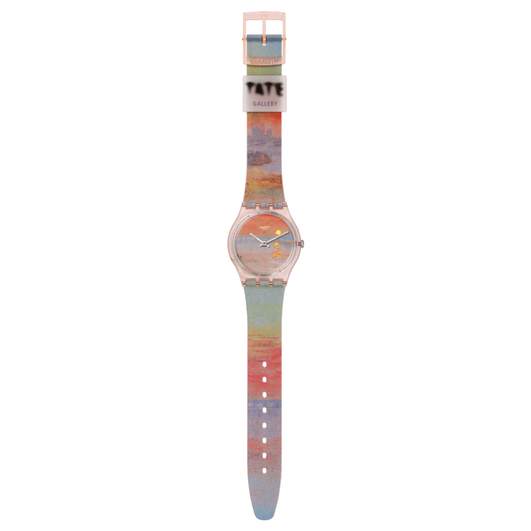 Il sole sul quadrante cambia leggermente colore ogni giorno grazie alla speciale ruota del calendario multicolore, il passante trasparente opaco è stampato con il logo della Tate Gallery. Joseph Mallord William Turner, The Scarlet Sunset c.1830-40. Photo: Tate / © Tate