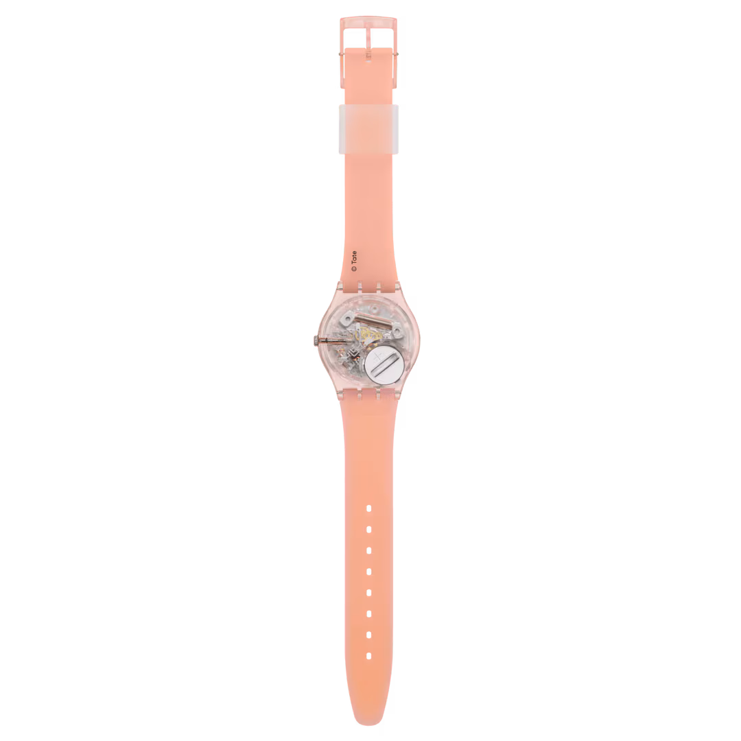 Quadrante e cinturino rosa opaco trasparente presentano una stampa dell’opera d’arte di JMW Turner, The Scarlet Sunset, lancette delle ore e dei minuti color argento con effetto fosforescente, cassa biosourced trasparente e rosa lucido con vetro biosourced